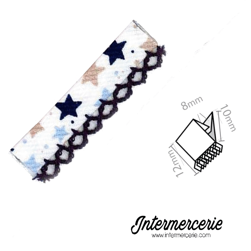 Biais picot imprimé 12mm posé, idéal pour vos bordures en habillement ou en décoration intérieure.